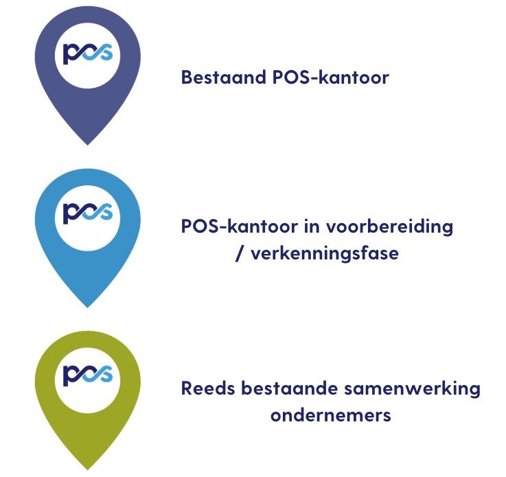 Bekijk onderstaande kaart om te zien waar alle POS-kantoren zich bevinden! Ben je op zoek naar een bestaand POS-kantoor bij jou in de buurt? Gebruik dan de filter ‘POS-kantoor’ links in de zoekfunctie van het kaartje of kijk naar de donkerblauwe icoontjes in het kaartje: